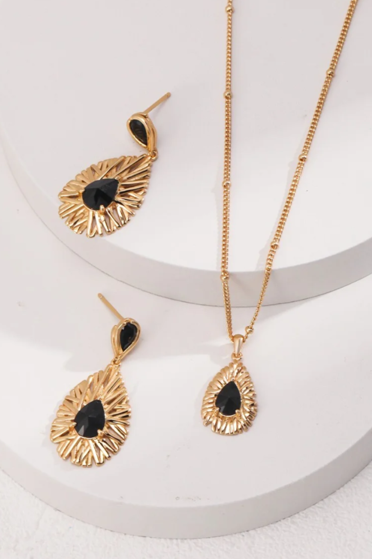 Celestial Noir Set: Featuring deep black zircon stones with layered teardrop silhouettes in champagne gold. A statement of poise and mystery.