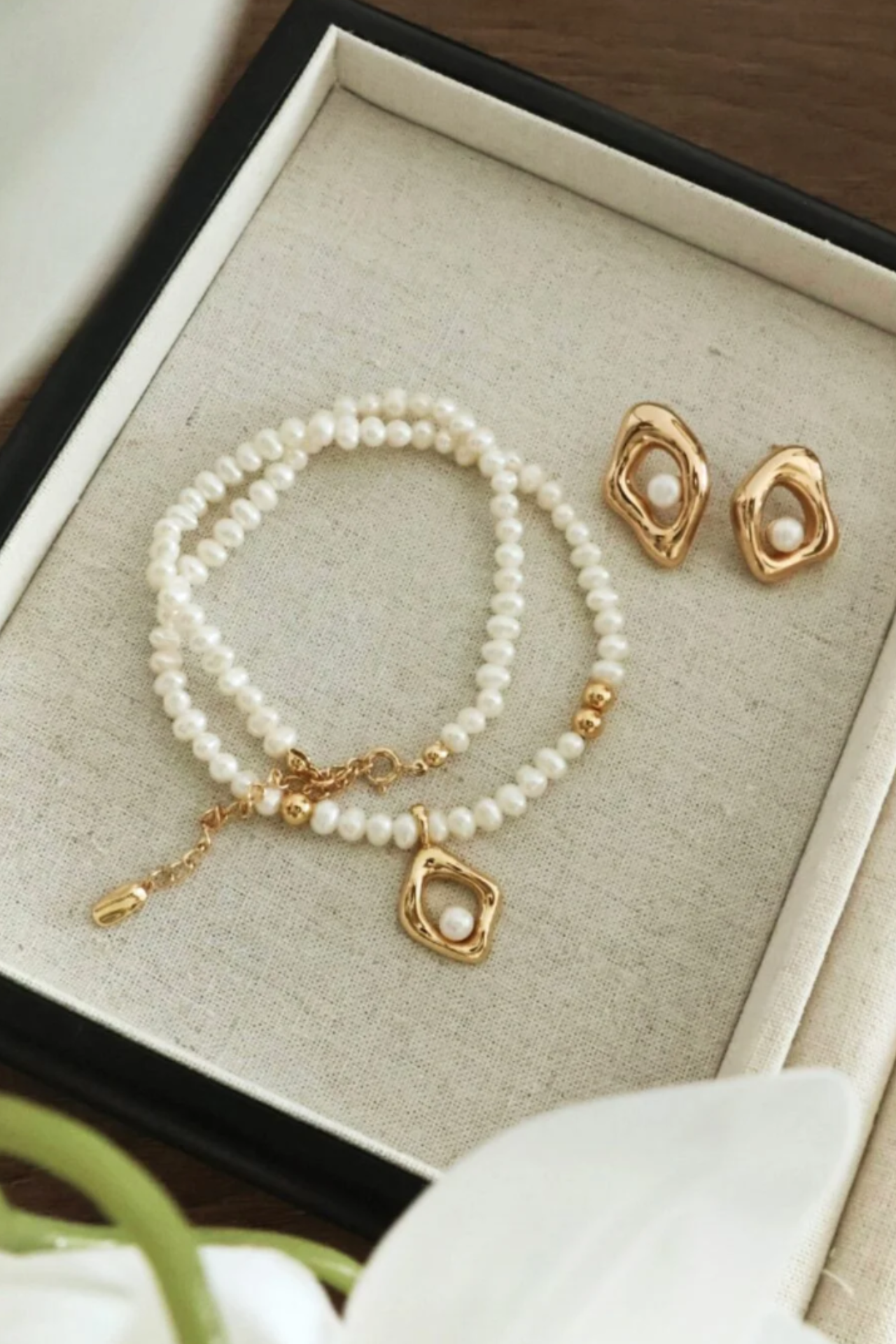 Modern Geometry Set: Understated and radiant with golden pearls and soft textures for a classic yet contemporary feel.