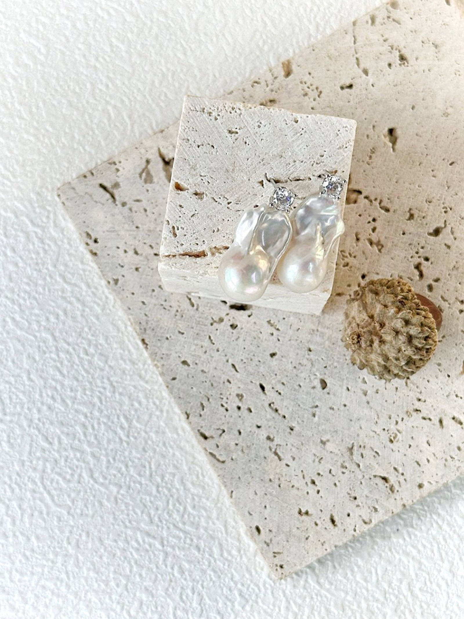 Sterling silver baroque pearl earrings, crowned with shimmering cubic zirconia, capturing the radiant beauty of dawn’s first light.