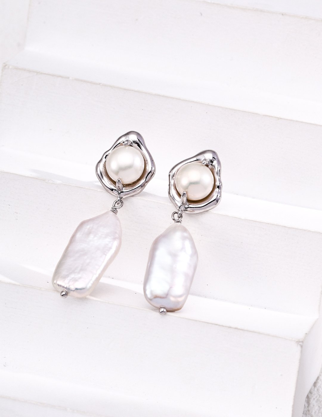 A celebration of organic beauty and graceful contrast, these earrings feature a delicate round pearl set atop a larger, uniquely shaped baroque pearl. The result is a design that is both structured and fluid, perfect for those who appreciate understated luxury.
