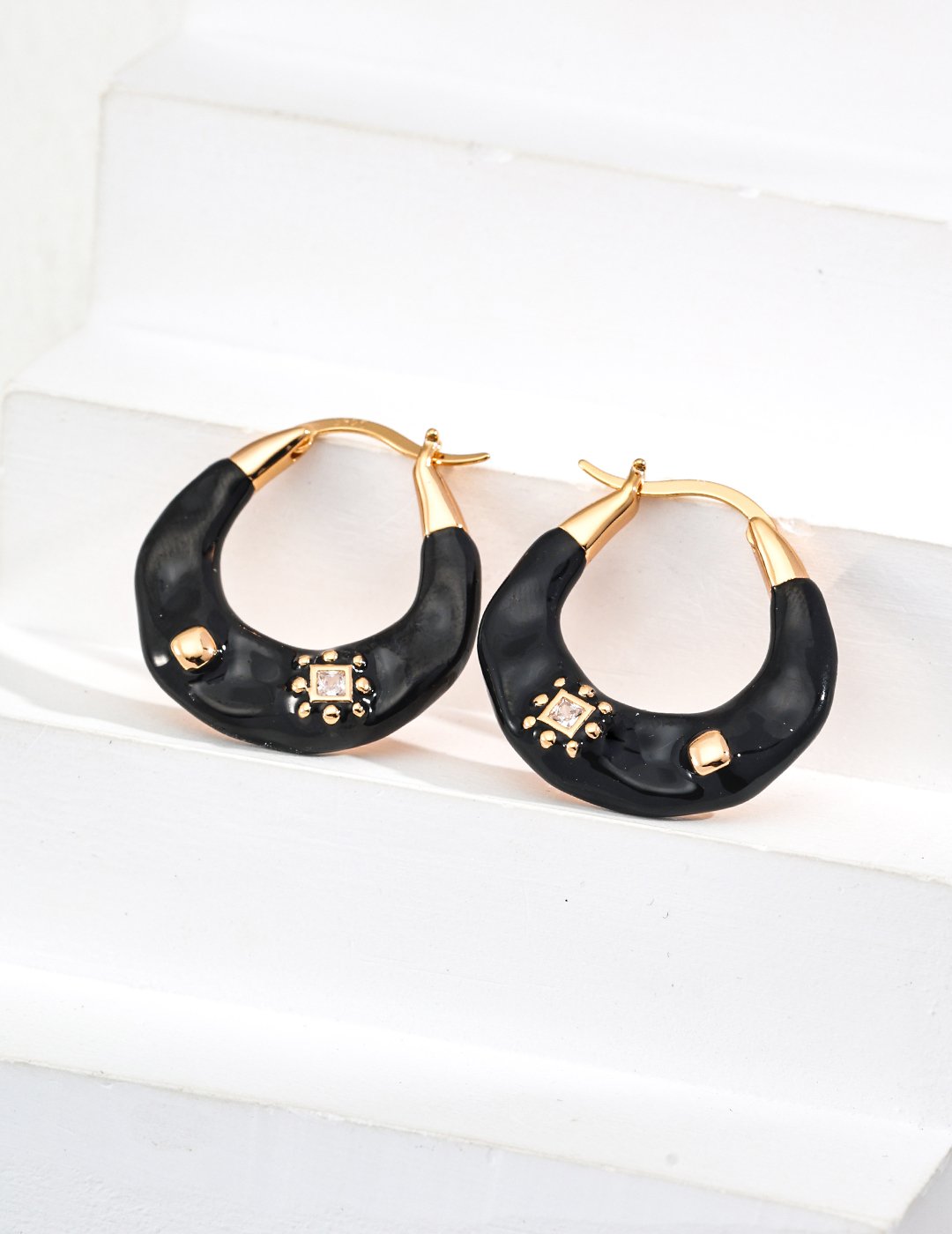 The Noir Chic earrings feature black enamel detailing, created using a low-temperature enamel technique, giving the surface a smooth, porcelain-like sheen. The gold-plated sterling silver setting adds warmth, while tiny zircon stones lend a subtle brilliance. A fusion of modern design and old-world craftsmanship.