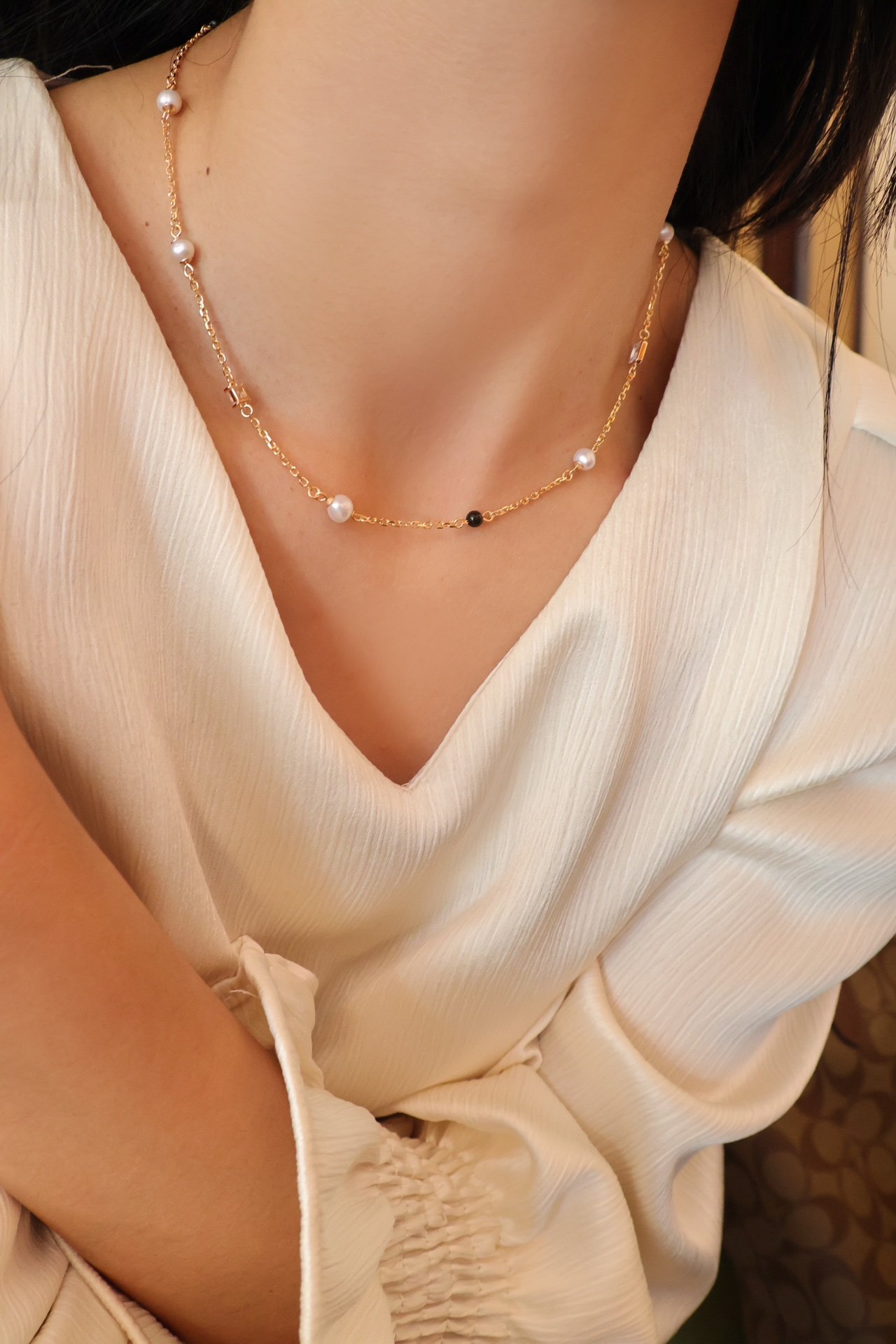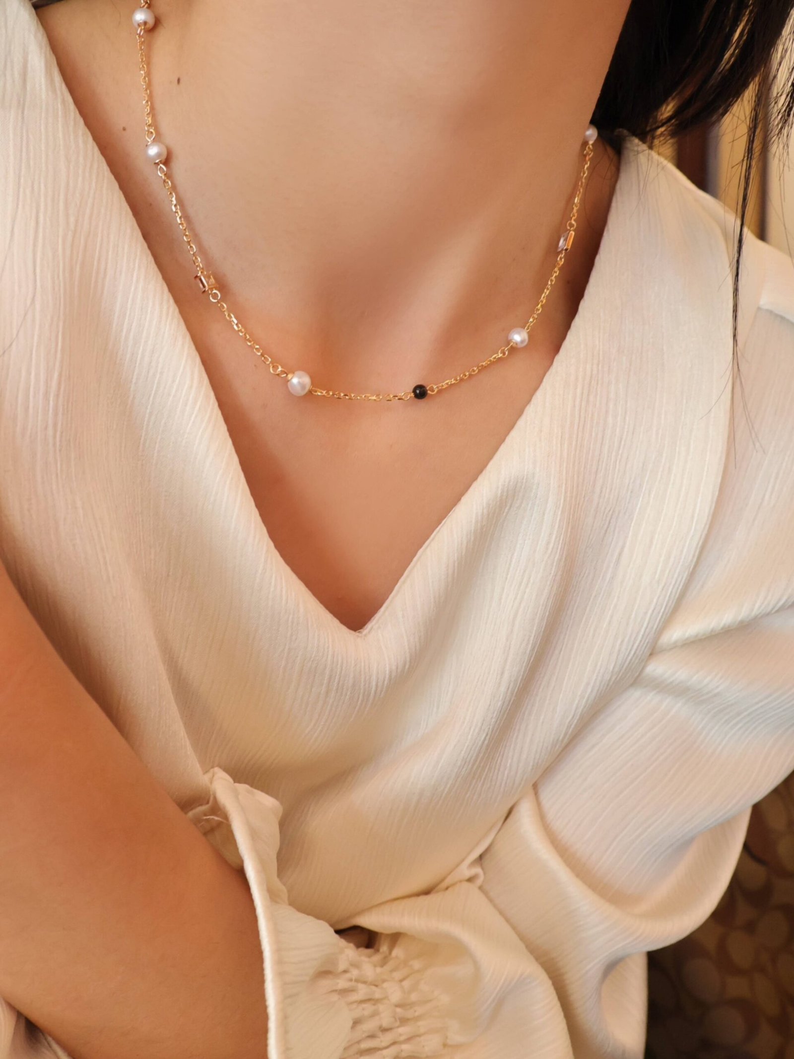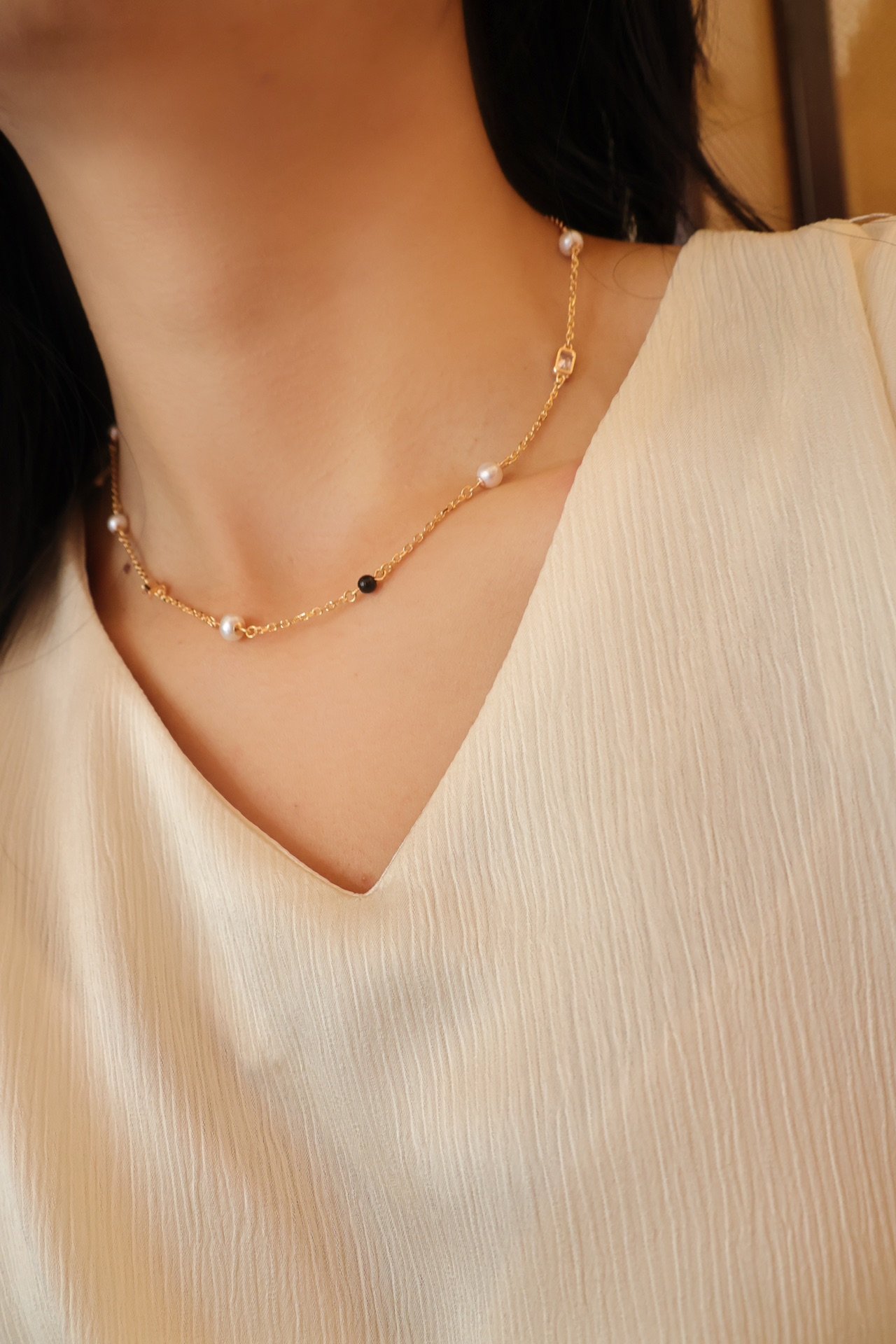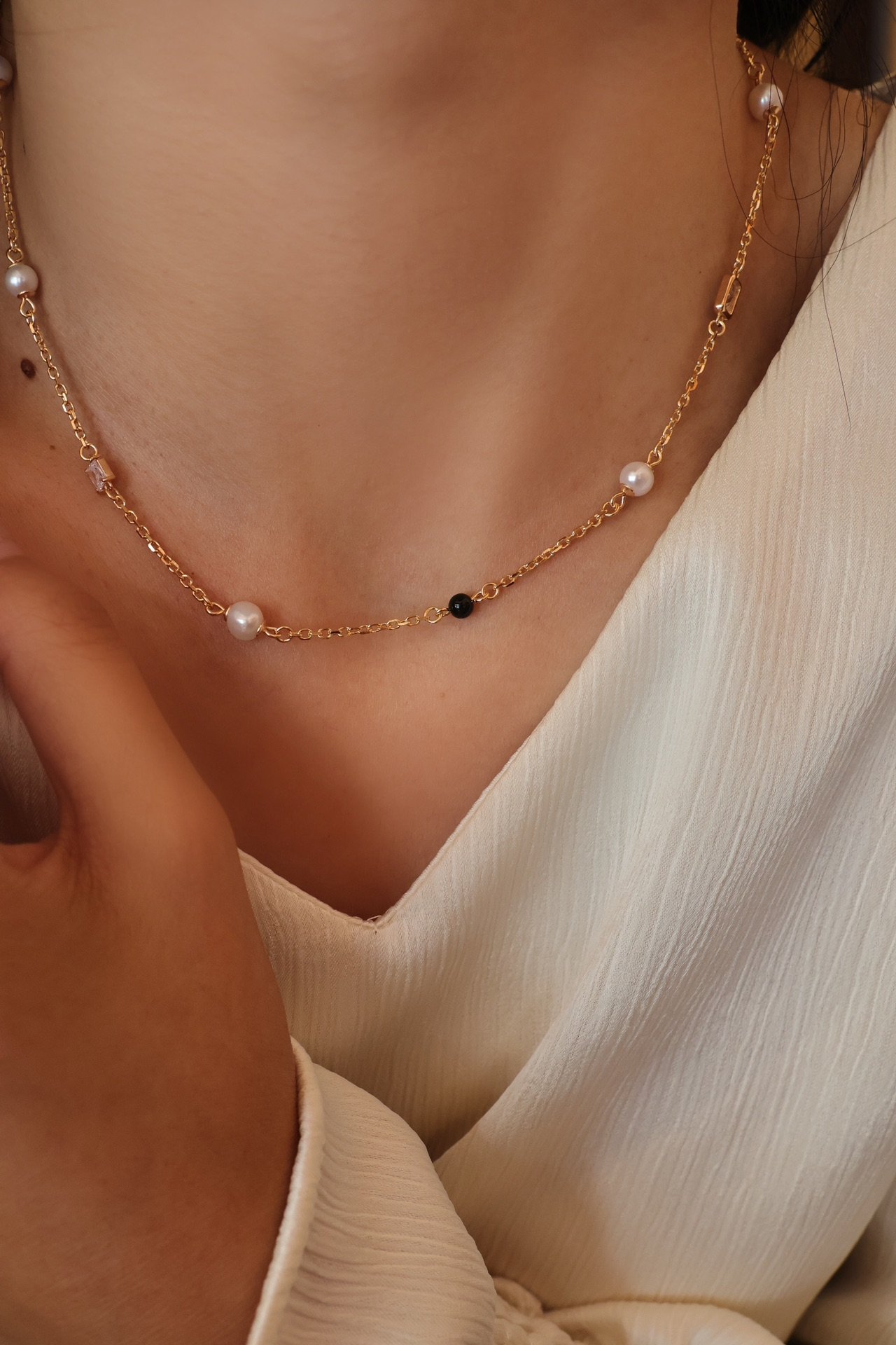 Part of our Holiday Series, the Whispers of the Sea necklace features a classic 925 sterling silver chain, adorned with polished black onyx, luminous freshwater pearls, and sparkling zircon accents. The contrast between deep black and soft white creates a balanced and timeless aesthetic, perfect for adding a touch of effortless glamour.