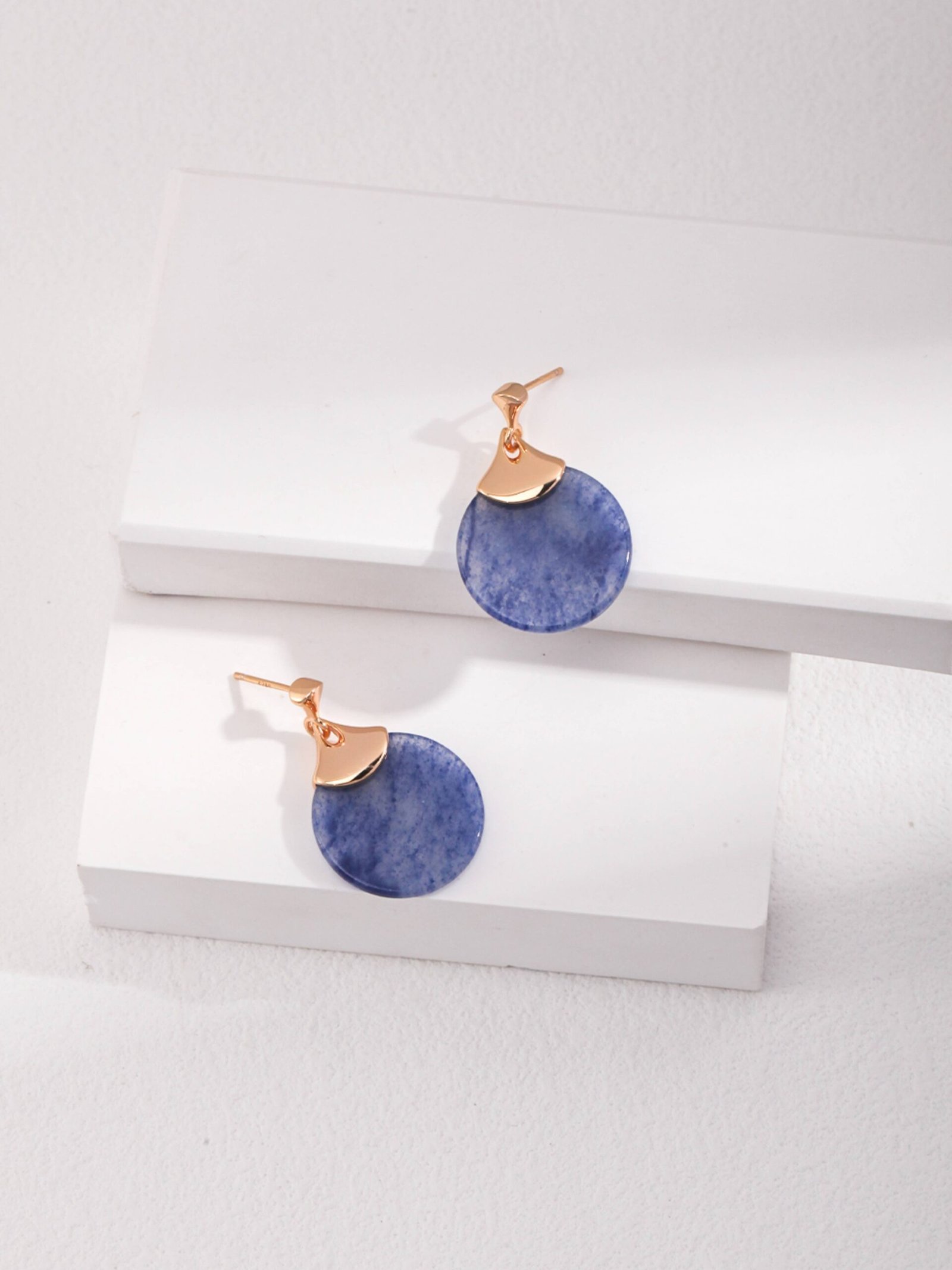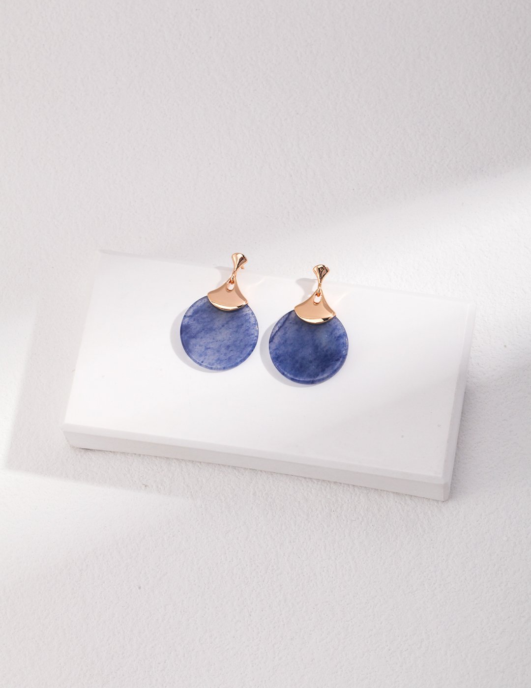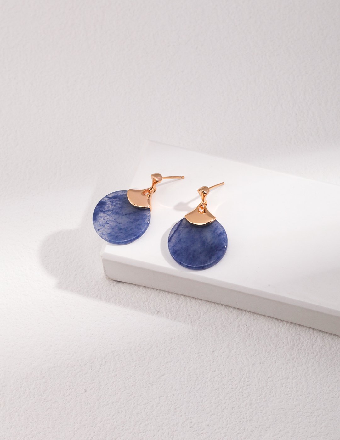 Infused with a hint of vintage allure and subtle bohemian charm, these earrings showcase a fan-shaped sterling silver frame gold plated embracing a soft blue aventurine gemstone. The delicate patterns of the stone reflect the tranquil hues of a twilight sky, making this piece an ode to grace and mystery.