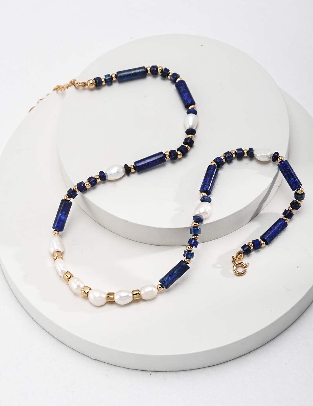 The Celestial Lapis Necklace captures the ethereal beauty of the moon and stars, blending the deep blue hues of lapis lazuli with the gentle luster of natural pearls. Set in 925 sterling silver with a vintage gold finish, this necklace is an ode to grace and inner strength. The smooth lapis lazuli stones, each uniquely veined with golden specks, represent wisdom and protection, while the delicate pearl adds a touch of purity and elegance. Its adjustable 36cm+5cm chain ensures a comfortable and flattering fit, making it a perfect piece to wear alone or layer with other favorites.