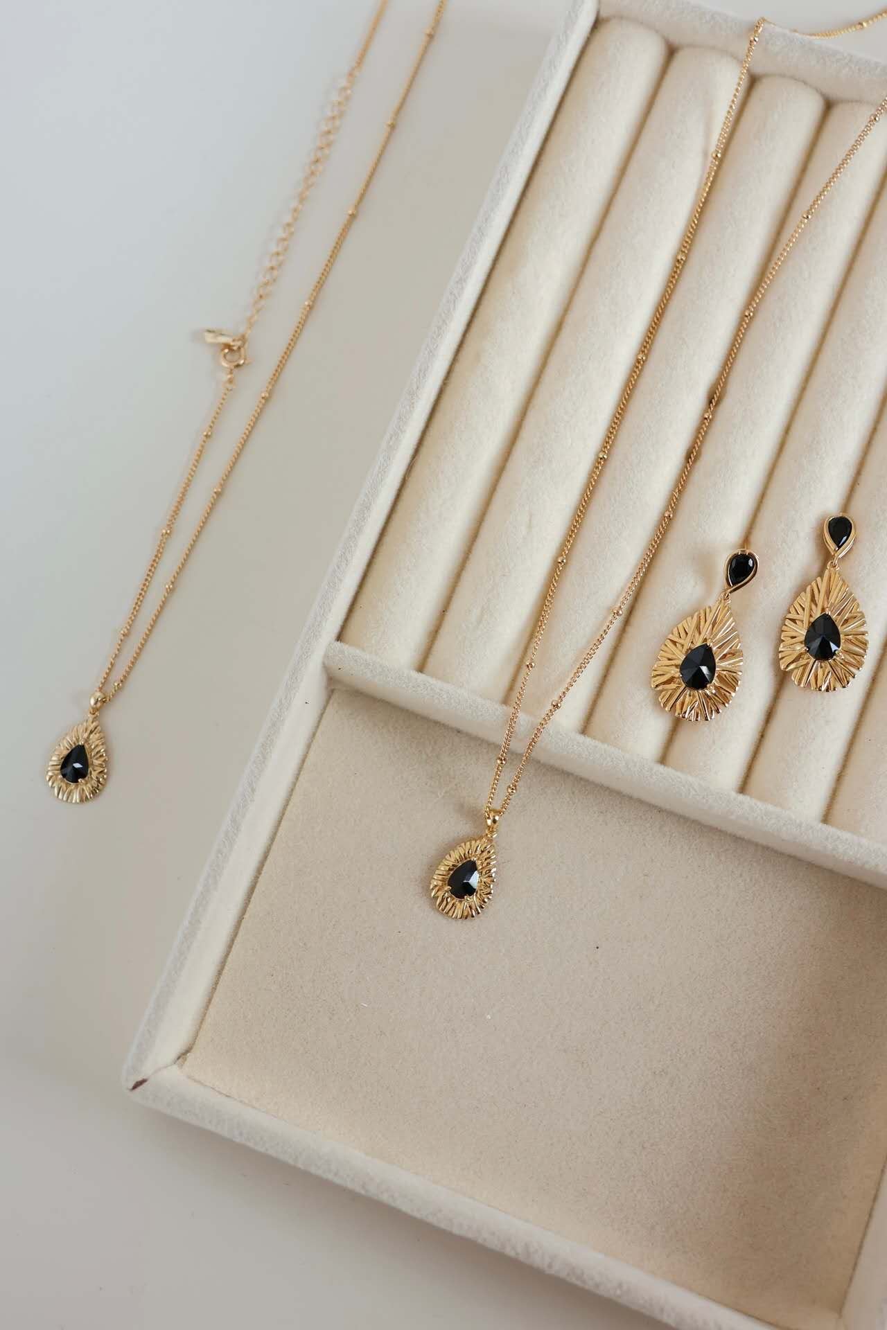 Elevate your jewelry collection with the Celestial Noir Jewelry Set, a stunning pairing of the layered black zircon necklace and matching earrings. This set embodies an undeniable aura of confidence and refinement, with its champagne gold-plated sterling silver base and striking black zircon accents. The dimensional craftsmanship and intricate detailing reflect an infinite charm, making this set a perfect gift for yourself or a loved one. Whether worn together for a bold statement or separately for a touch of elegance, the Celestial Noir Set is a true symbol of timeless sophistication.