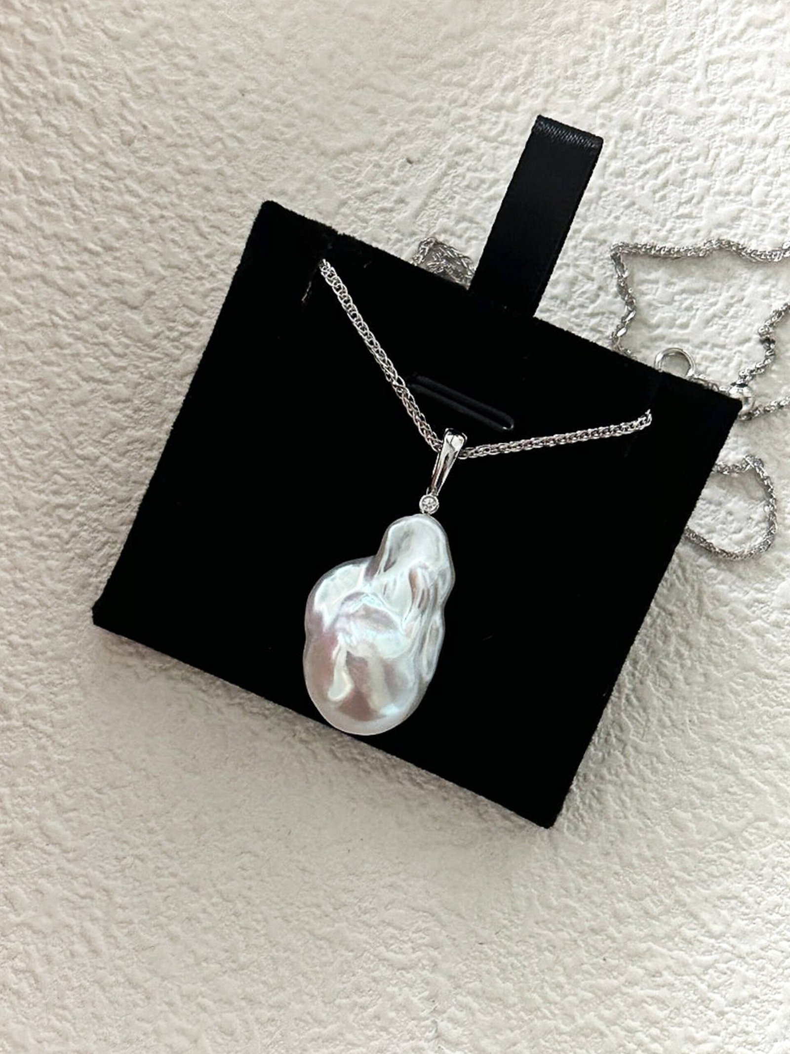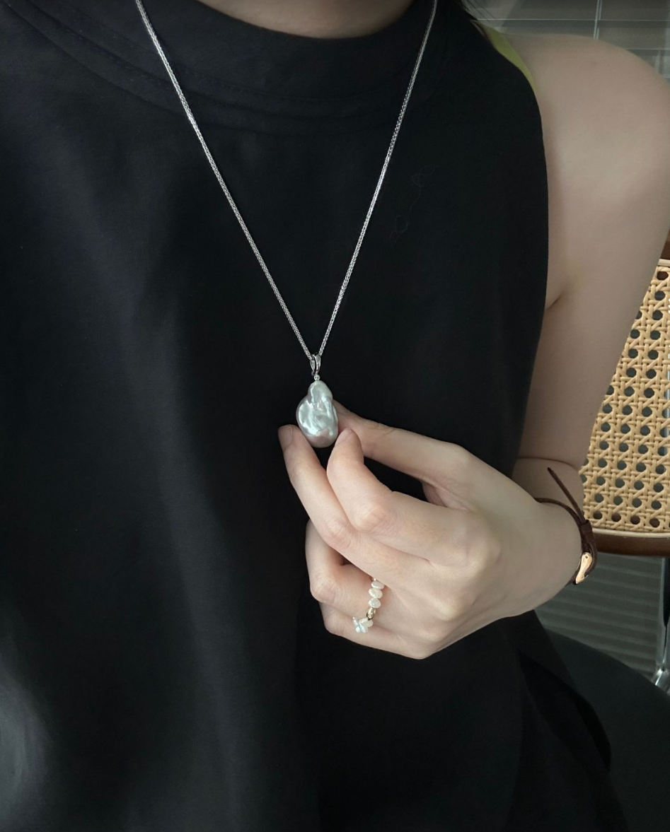 The Ethereal Boundless necklace is a testament to modern luxury. The voluminous baroque pearl showcases its own organic beauty, strung on a sterling silver chain with a universal clasp, offering a variety of ways to wear it