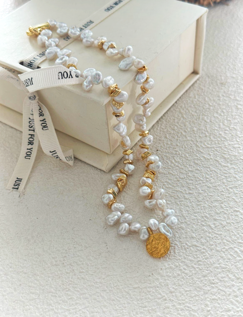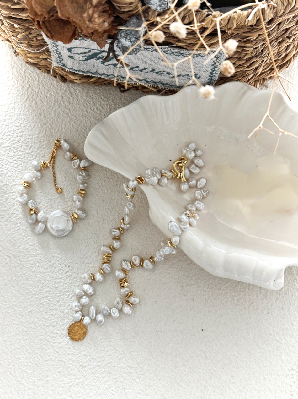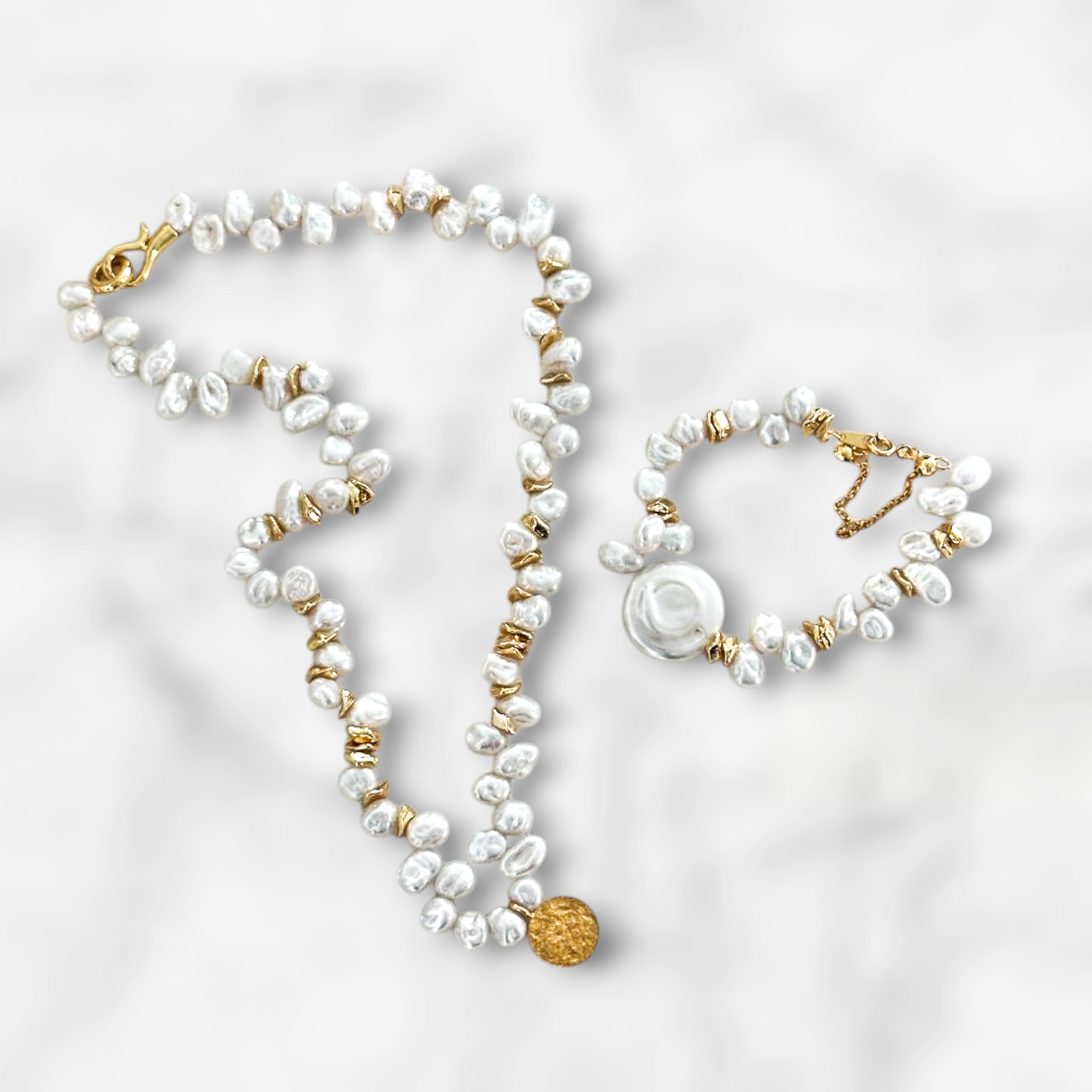 For those who seek serenity and splendor, the Golden Crest Set is a symphony of luminescence and warmth. The matching necklace and bracelet embrace the organic beauty of keshi pearls, allowing their glow to complement your own. Wear them together for an air of poetic elegance.