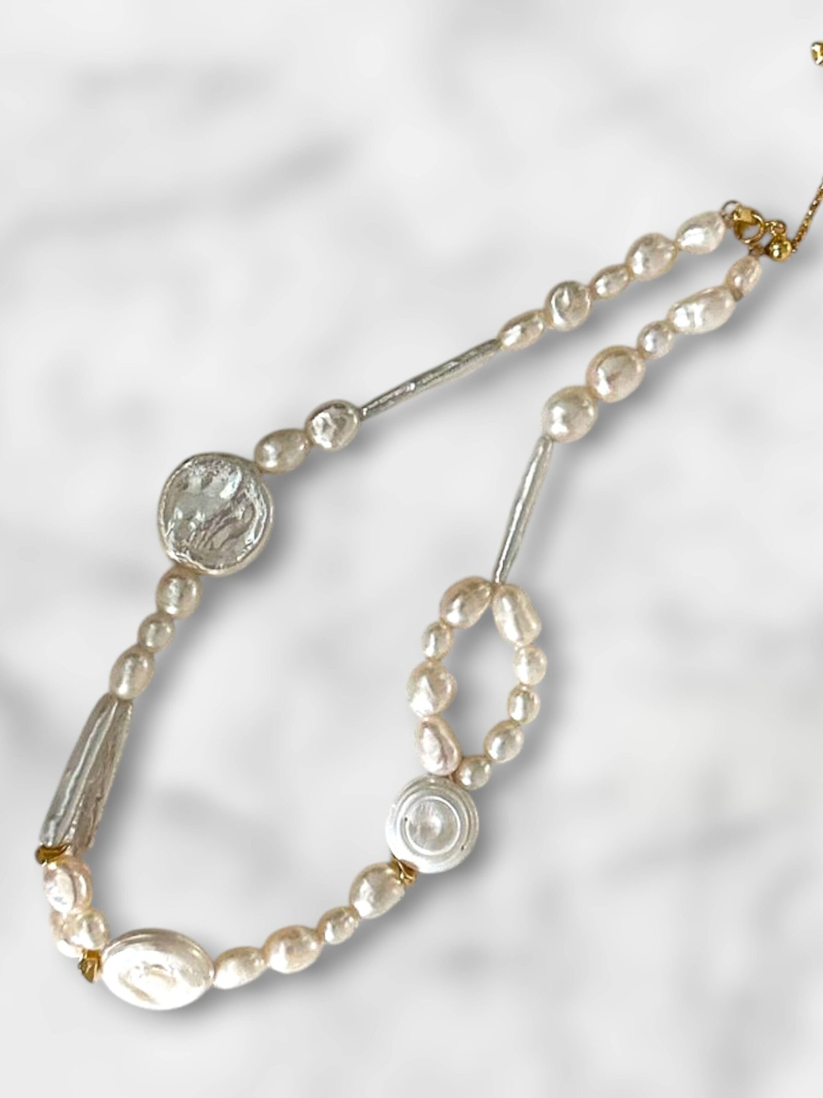 Effortlessly chic, unmistakably French. This choker is an homage to Parisian elegance, where round pearl discs and lustrous pearls come together in perfect harmony. A piece that feels both modern and vintage, delicate yet bold—ideal for those who love timeless sophistication with a hint of romance.