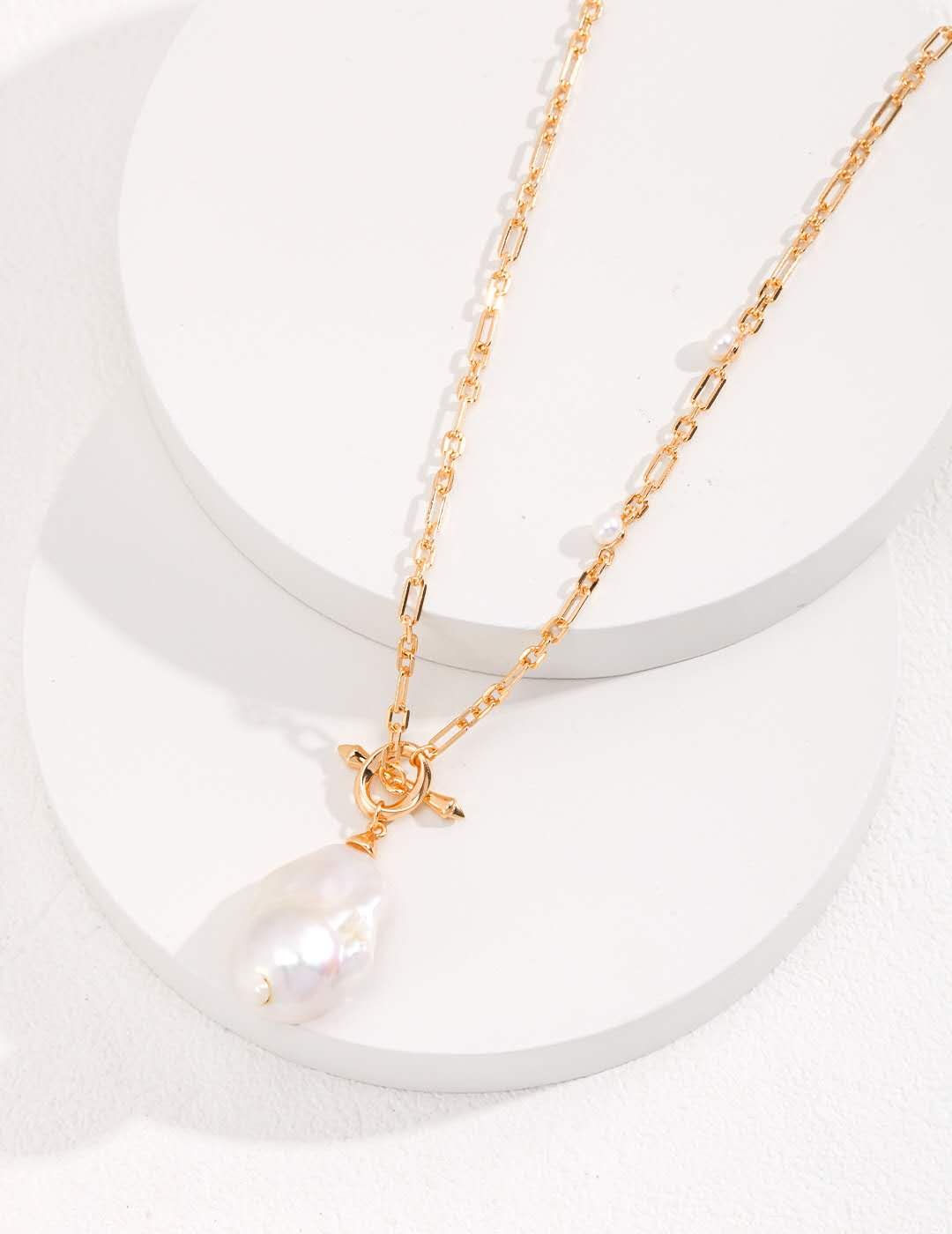 This exquisite necklace features a natural baroque pearl pendant set on a 60cm sterling silver chain plated with 18k gold, offering a luxurious yet contemporary touch.