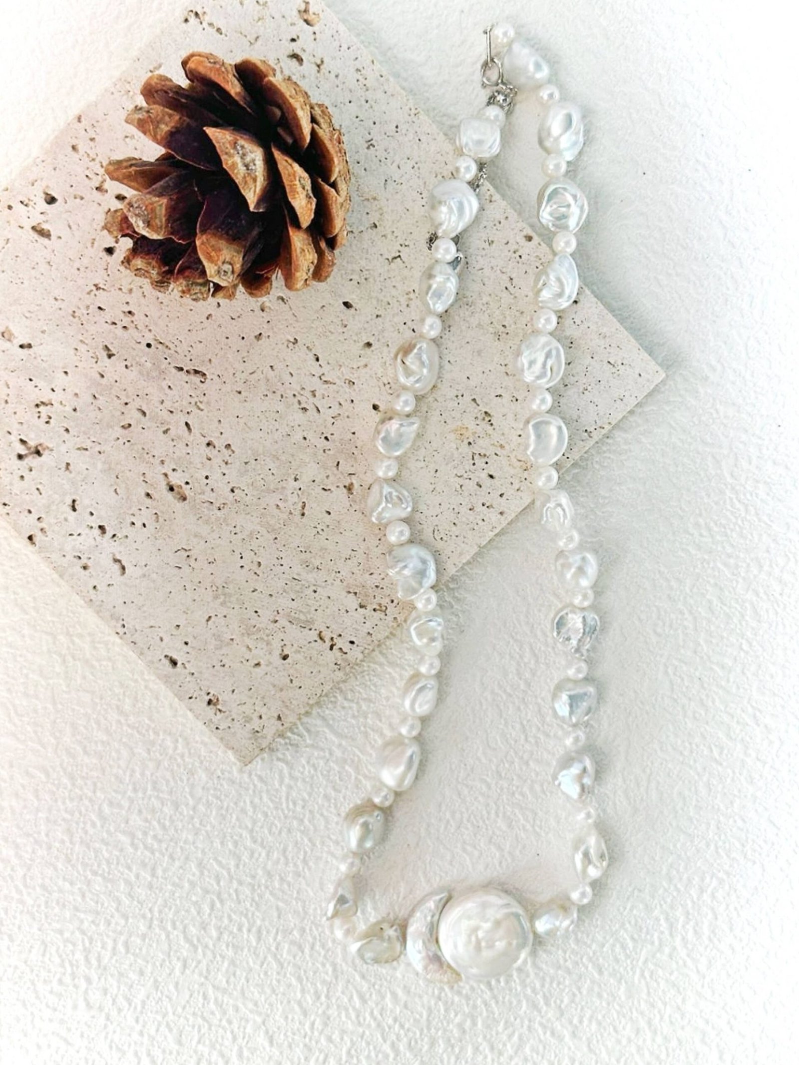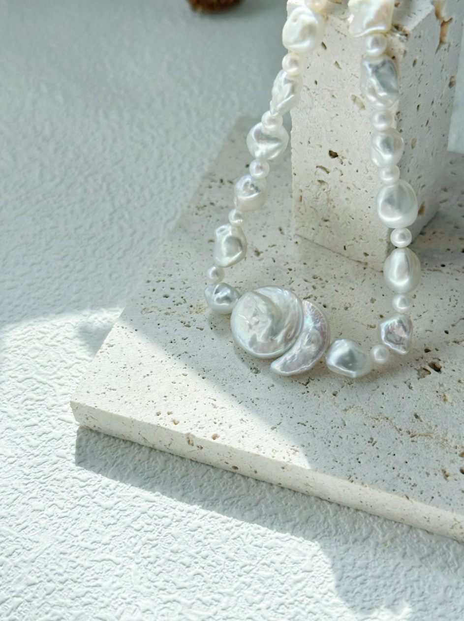 Bathed in the quiet glow of twilight, the Soluna Harmony Necklace captures the poetic embrace between sun and moon. The asymmetry of natural baroque pearls echoes the organic beauty of nature, while the celestial pearl anchors the piece with serene symbolism. A radiant piece that invites you to shine — whether at sunrise or under moonlight.