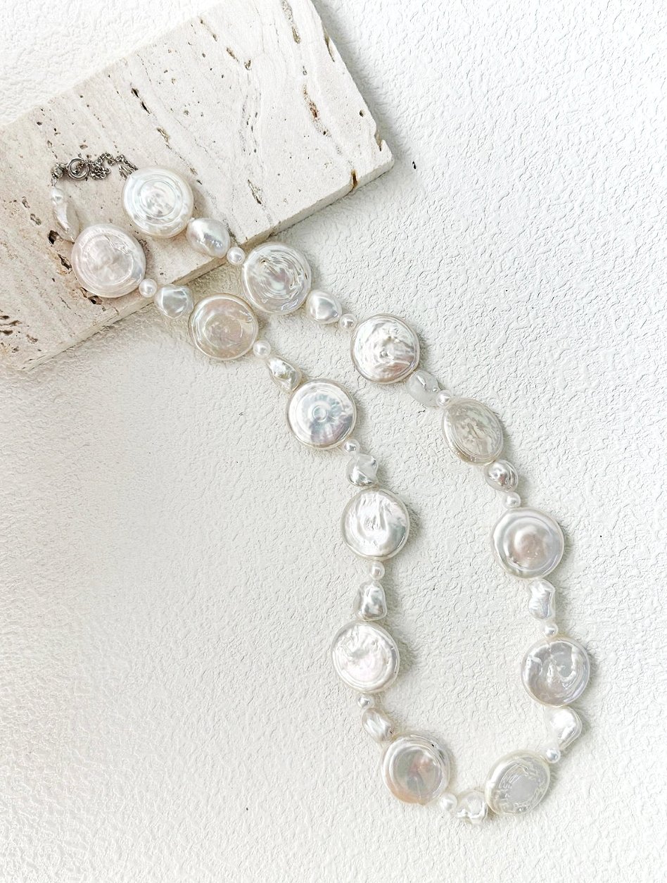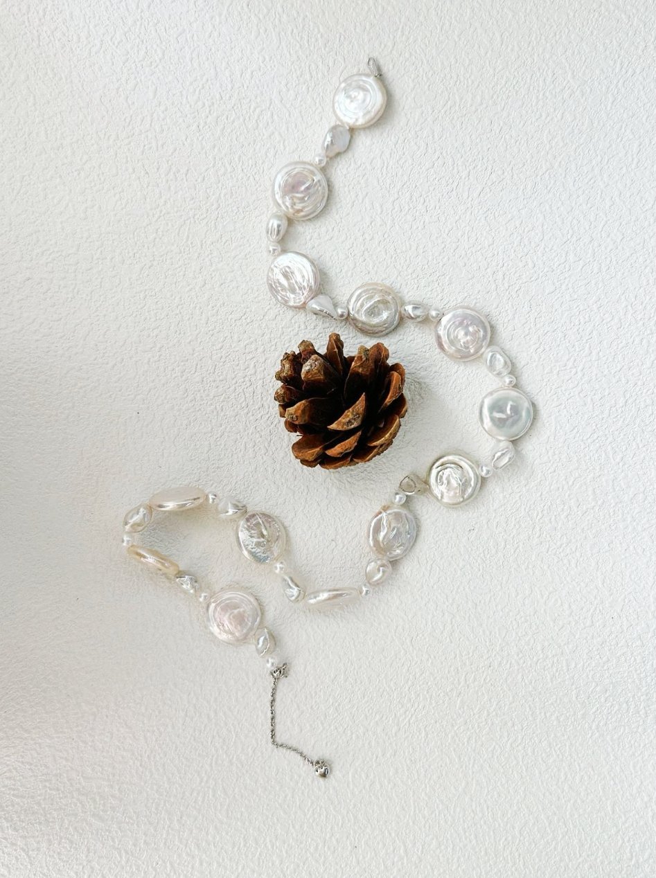Bathed in the soft radiance of dawn and dusk, the Solunar Drift Necklace evokes the ebb and flow of cosmic tides. Each baroque pearl is uniquely shaped, echoing the organic rhythm of nature. With a refined sterling silver clasp, this necklace is perfect for moments both intimate and infinite.